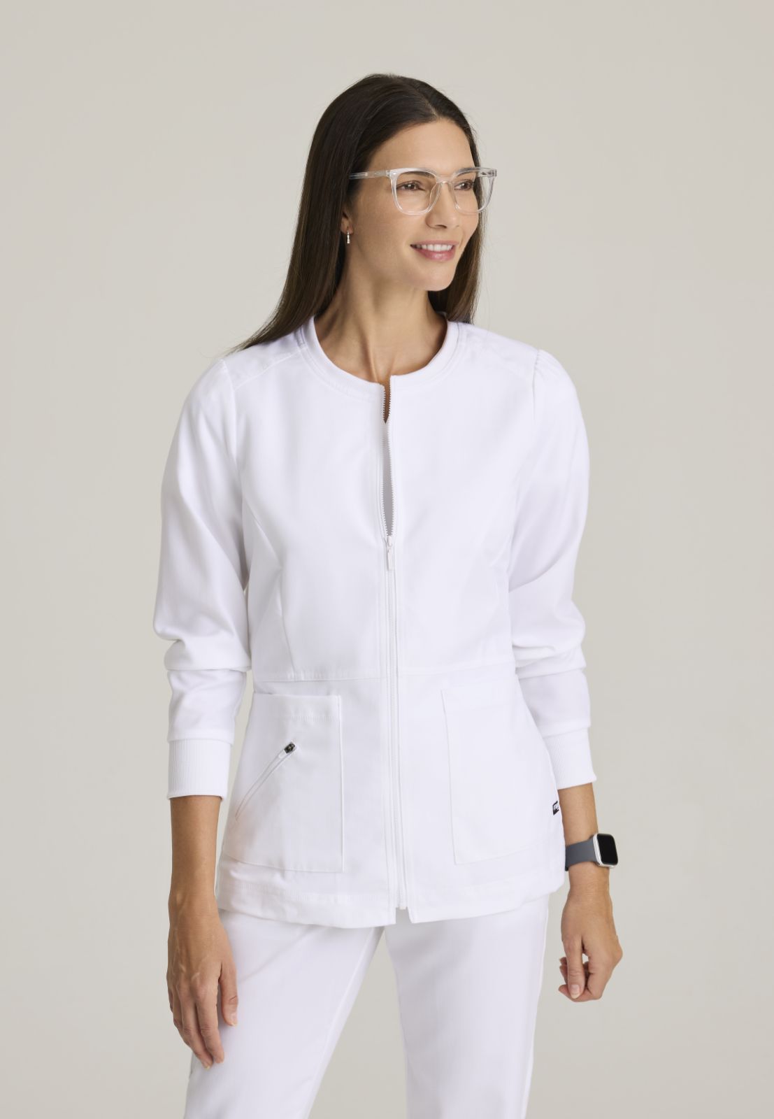Цей медичний топ з V-подібним вирізом має нагрудну кишеню, дві накладні кишені, кишеню для мобільного телефону, приховані петлі для інструментів всередині лівої кишені, задній шов кокетки та бічні розшарування. Довжина по центру спинки: 28 дюймів.